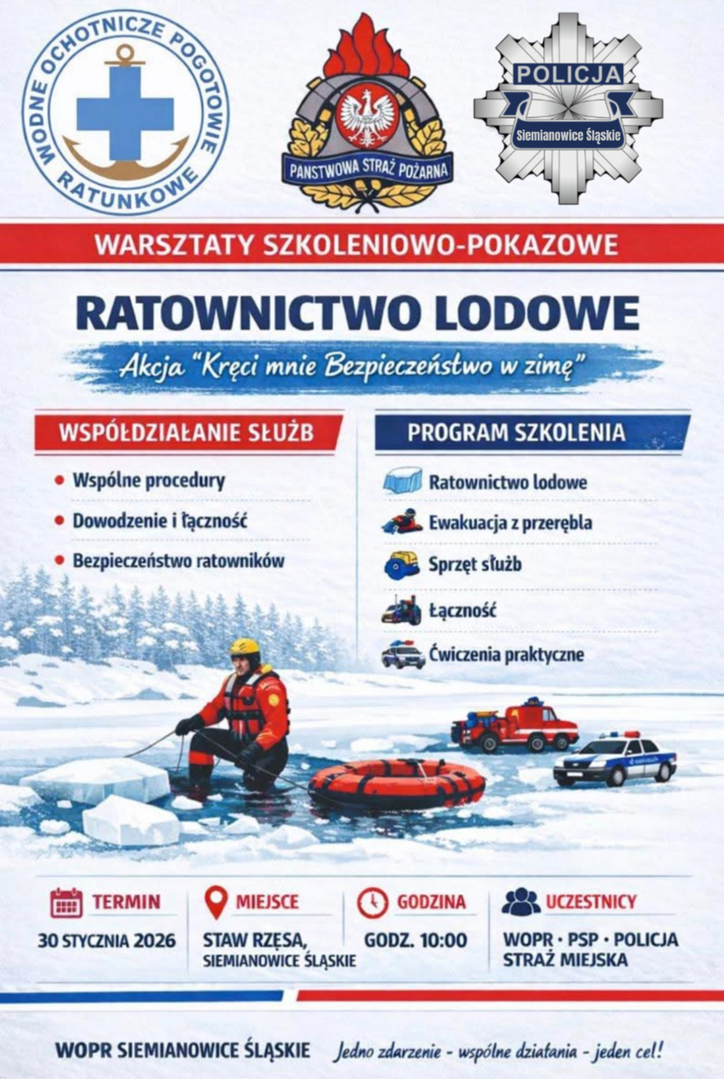 Służby z Siemianowic Śląskich - Wodne Ochotnicze Pogotowie Ratunkowe, Państwowa Straż Pożarna, Straż Miejska i Policja już 30 stycznia 2026 roku, o godzinie 10.00 nad stawem „Rzęsa” w Siemianowicach Śląskich połączy siły i poprowadzi wydarzenie, podczas którego przybliżane będą realia codziennej pracy, a szczególnie w trudnych, zimowych warunkach.