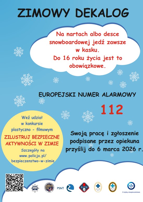 Zachęcamy dzieci i młodzież od 5 - 16 roku życia do wzięcia udziału w konkursie plastyczno-filmowym. Tematem konkursu jest zobrazowanie bezpiecznego spędzania czasu w okresie zimowym. Organizatorem konkursu jest Komenda Główna Policji wspólnie z Partnerami.