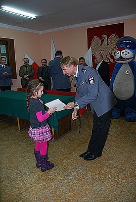 Uroczysta prezentacja kalendarza odbyła się dzisiaj o 13.00 w siemianowickiej komendzie. Młode artystki z rąk Komendanta Miejskiego Policji w Siemianowicach Śląskich mł. insp. Cezarego Garczarczyka, I Zastępcy Komendanta podinsp. Krzysztofa Burka oraz zaproszonych gości odebrały upominki, wśród których znalazła się maskotka śląskiej policji -Sznupek.
